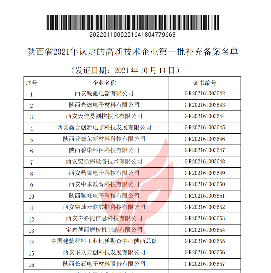 我公司荣获2021年度“国家级高新技术企业”陕西省内企业第一名!!!